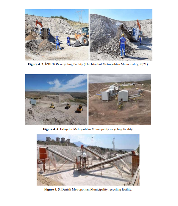 Avrupa Birliği’ne üyelik çalışmaları kapsamında Türkiye’de inşaat ve yıkım atıklarının geri kazanımına yönelik 25406 sayılı Hafriyat Toprağı, İnşaat ve Yıkıntı Atıklarının Kontrolü Hakkında Yönetmelik hazırlanmıştır. Ancak sunulan yönetmelikte malzemelerin geri dönüşümü ve yeniden kullanılması konusunda yapılacak çalışmalar oldukça yetersizdir. Türkiye’de kullanılan en yaygın ve geçerli geri dönüşüm yöntemi “tarlada ayıklama” yöntemidir. Ancak ülkemizin düzenli katı atık ayrıştırma ve geri kazanım tesisleri oldukça düşüktür. Türkiye’de geri dönüşüm oranı %25’tir. Bu oranın %20’si özel sektöre, %5’i ise kamu sektörüne aittir. Türkiye’de yürütülen her türlü altyapı, bakım-onarım, imalat ve inşaat projelerinin faaliyetleri sonucunda inşaat ve yıkım atıkları ortaya çıkmaktadır. Bu atıkların çevre kirliliğine yol açmayacak şekilde taşınması, depolanması, bertaraf edilmesi ve yeniden kullanılmasına yönelik çalışmalar, sürdürülebilir kalkınma ilkesi doğrultusunda yasa ve yönetmeliklere uygun olarak Türkiye’de Büyükşehir Belediyeleri aracılığıyla yürütülmektedir. , 2018). Örneğin İzmir Büyükşehir Belediyesi’nin bir kuruluşu olan İZBETON, Şekil 4.3’te gösterilen tesiste inşaat ve yıkım atıklarını geri dönüştürmektedir. Elde ettiği geri dönüştürülmüş agregaları yol inşaatlarında dolgu malzemesi olarak kullanmaktadır. Eskişehir Büyükşehir Belediyesi ise Şekil 4.4’te gösterilen 13 hektarlık arazi üzerine kurduğu tesis ile geri dönüştürülen atık agregaları altyapı olarak kullanmakta ve malzeme doldurmaktadır. Denizli’deki tesiste (Şekil 4.5) Özel bir şirket tarafından işletilen tesiste yılda 306.000 ton inşaat ve yıkım atığı geri dönüştürülüyor
