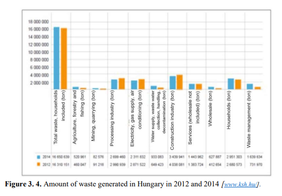 Şekil 3.4’te 2012 ve 2014 yıllarında üretilen atıkları ve 8 büyük ekonomik faaliyetten kaynaklanan atıkların (ton cinsinden ifade edilen) dağılımı ve Macaristan’daki haneler. Şekil 3.4’te görebileceğimiz gibi inşaat atıkları farklı şekillerde üretilmektedir. Her branşta ölçülmekte olup, önemli miktarı artış eğilimi göstermektedir. İnşaat ve yıkım atıkları profesyonellere ciddi sorunlar yaşatıyor Macaristan’da da atık yönetimi alanında çalışan kişiler var. Macar 2014-2020 dönemine ait Atık Yönetim Planı, ayrıştırılan atıkların inşaat ve yıkım atıklarının alınması ve kullanılması sadece küçük bir ölçekte çözülmektedir. ölçek.